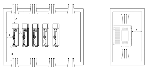并排安裝時,橫向兩側(cè)建議各留 30mm 以上間距V1規(guī)格,無風扇結(jié)構(gòu),采用側(cè)面散熱片進行散熱,因此必須留有30mm的間隙)。首尾兩臺驅(qū)動器與柜體側(cè)面之間,至少留有 50mm 間隙。